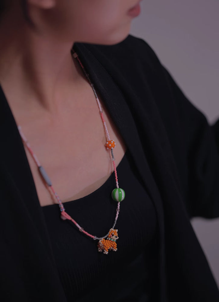Beaded necklace with a small Shiba Inu dog charm on a black background